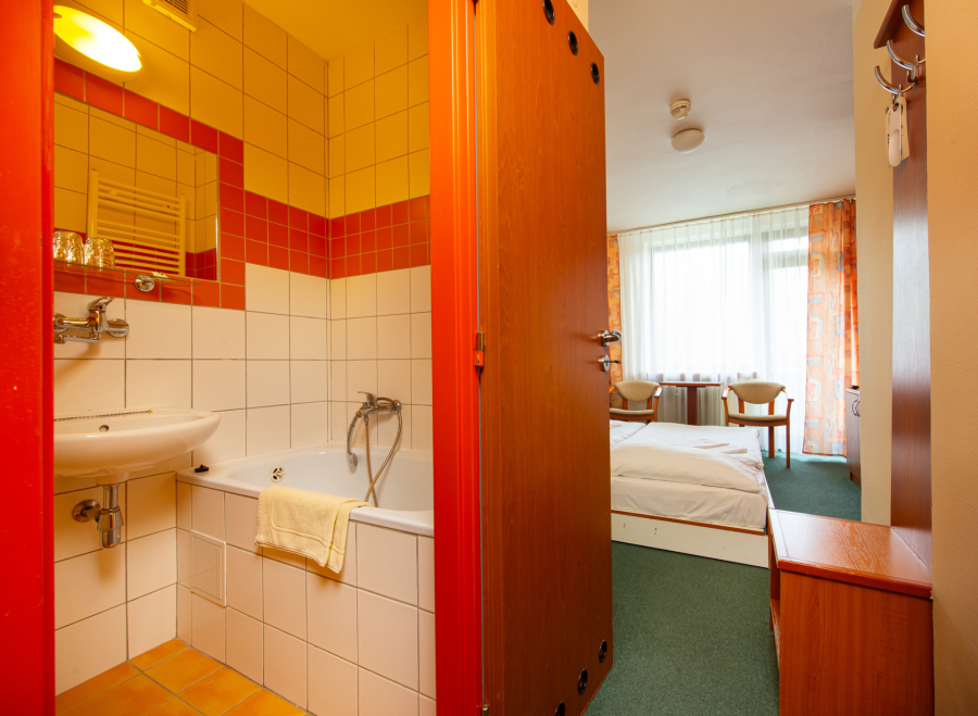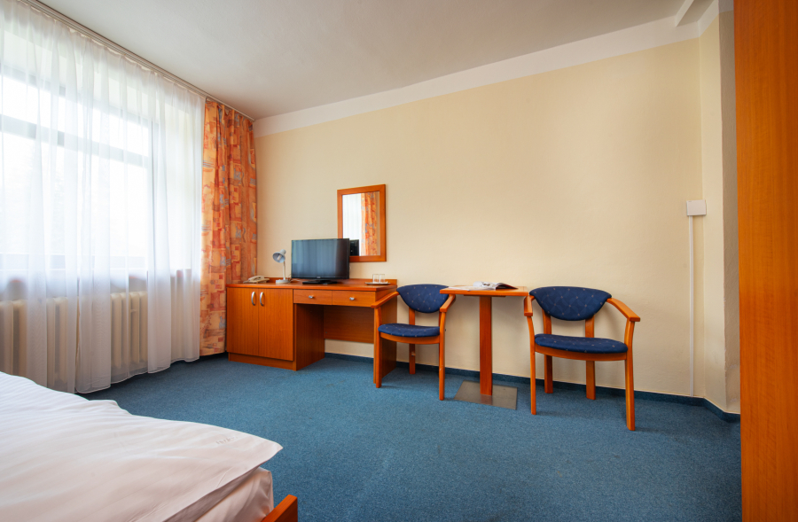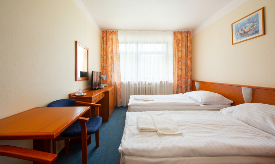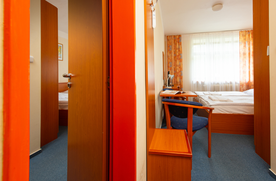 Komfortne zariadená jednoposteľová izba pre 1 osobu s možnosťou 1 prístelky prepojená s izbou s oddelenými posteľami pre 2 osoby. Izba je bez balkóna na vyvýšenom prízemí. Detská postieľka na vyžiadanie.
