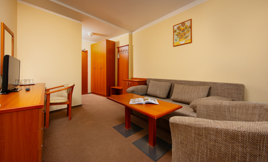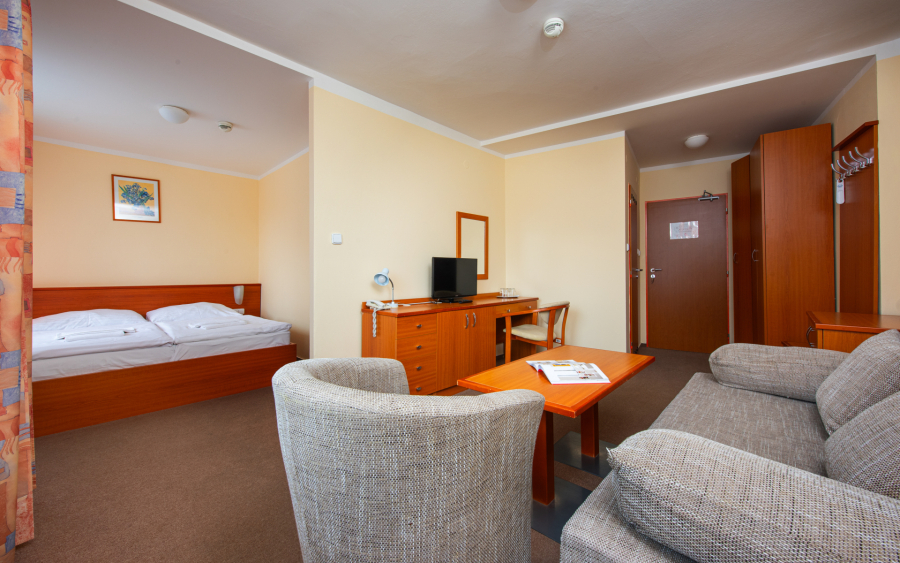 V pohodlne zariadenej a priestrannej rodinnej izbe sa nachádza manželská posteľ pre 2 osoby a rozťahovací gauč slúžiaci ako prístelka pre ďalšie 2 osoby. V izbe sa nachádza balkón s výhľadom na lanovku Biela Púť. Detská postieľka na vyžiadanie.